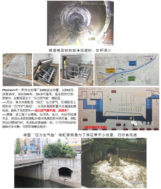 排水管道設(shè)計(jì)一定是從末端向起端設(shè)計(jì)的,污水、雨水管道要與下游道路污水、雨水管相接、與泵站相接,雨水管甚至要直接接入水體。所以一定要搞清楚相接點(diǎn)基本設(shè)計(jì)要素,管徑、坡度、管底高程,更要對(duì)下游系統(tǒng)可否接入所設(shè)計(jì)管道的設(shè)計(jì)水量進(jìn)行必要的驗(yàn)算和復(fù)核,可不能夠把管子“一捅了之”。能否把大學(xué)排水工程課本里的“管頂平接”、“水面平接”應(yīng)用到實(shí)際情景中,就是基本功的體現(xiàn)。雨水直接排入水體,就一定要說(shuō)清楚所排入的水體基本情況,如常水位、多年平均高水位、最高水位等。要提醒的是:保證“不淤流速”是排水管道設(shè)計(jì)的靈魂,一定要慎用“最小坡度”,特別是在按照遠(yuǎn)期流量設(shè)計(jì)時(shí),否則就要考慮沖淤措施。德國(guó)“壓力空氣墊”的倒虹管就是案例。自流雨水排水口一定要在常水位以上,一定要避免淹沒(méi)出流,否則設(shè)計(jì)的就不是滿管重力流,設(shè)計(jì)方法就錯(cuò)了。