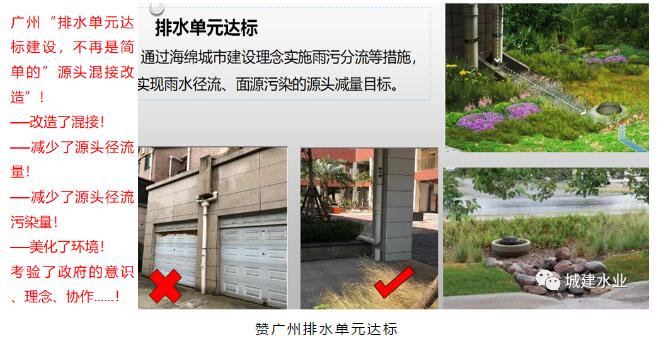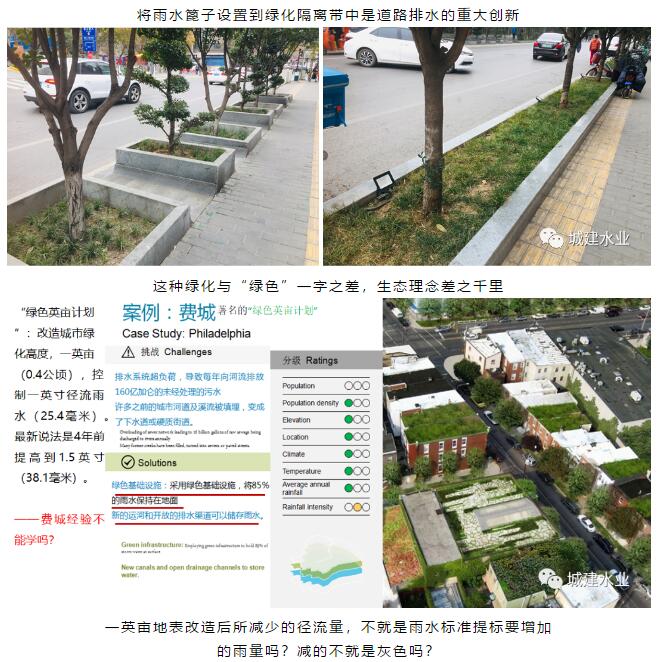 道路排水管道要為將服務(wù)范圍內(nèi)排水對(duì)象的污水、雨水有效接入創(chuàng)造條件。自2006年,上海市水務(wù)局在推進(jìn)第三輪環(huán)保三年行動(dòng)計(jì)劃時(shí),就提出了二級(jí)管網(wǎng)(沿道路敷設(shè),服務(wù)于道路兩側(cè)排水戶的排水管道)包括伸出道路紅線一米的支管和支管末端檢查井,以便于三級(jí)管網(wǎng)(街坊、小區(qū)、企事業(yè)單位內(nèi))排水管道的接入?,F(xiàn)在看來(lái),無(wú)疑是對(duì)實(shí)現(xiàn)污水全收集是正確和合理的。另外為了應(yīng)對(duì)雨水排水標(biāo)準(zhǔn)提高,有兩個(gè)做法,一是做“加法”,二是做“減法”?!凹臃ā辈粏问前凑招碌臉?biāo)準(zhǔn)加大道路雨水管管徑,更重要的是要按照新的雨水標(biāo)準(zhǔn)把雨水篦子和連管設(shè)置好,要讓雨水系統(tǒng)能夠做到(雨水口)“嘴巴喝得進(jìn)”、(連管)“嗓子進(jìn)得去”、(道路雨水管)“腸子不梗阻”、(雨水排口)“排口排得出”。一定要記住脫離雨水收集口的雨水排水設(shè)計(jì)是不完整的雨水排水設(shè)計(jì)?!皽p法”就是做好LID,利用“海綿措施”把徑流量減下來(lái),“減法”實(shí)際上也是對(duì)“進(jìn)口”一種創(chuàng)新設(shè)計(jì)。將道路綠化隔離帶、人行道、小區(qū)內(nèi)部、屋頂進(jìn)行海綿化改造和設(shè)計(jì),這就是創(chuàng)建“海綿城市”的具體行動(dòng),這就是城市工程海綿化。圖中美國(guó)費(fèi)城的“綠色英畝計(jì)劃”案例就證明,“減法”是雨水排水提標(biāo)的重要手段。做好“減法”還會(huì)收到一個(gè)非常好的效果,那就是有效減少了“徑流污染”,這是實(shí)現(xiàn)城市水體“下雨不黑”的最有效措施?!皽p法”體現(xiàn)的是“綠、灰”相結(jié)合,體現(xiàn)的是“優(yōu)先考慮更多利用自然力量排水”。廣州利用綠色措施實(shí)現(xiàn)“排水單元達(dá)標(biāo)”就是對(duì)雨污混接改造工作的創(chuàng)造性發(fā)展。很多城市雨水排水規(guī)劃、設(shè)計(jì)文件為體現(xiàn)海綿城市創(chuàng)建和提標(biāo),不談綠色措施,而簡(jiǎn)單地將“綜合徑流系數(shù)”調(diào)整0.6是不科學(xué)、不現(xiàn)實(shí)和不負(fù)責(zé)任的做法。